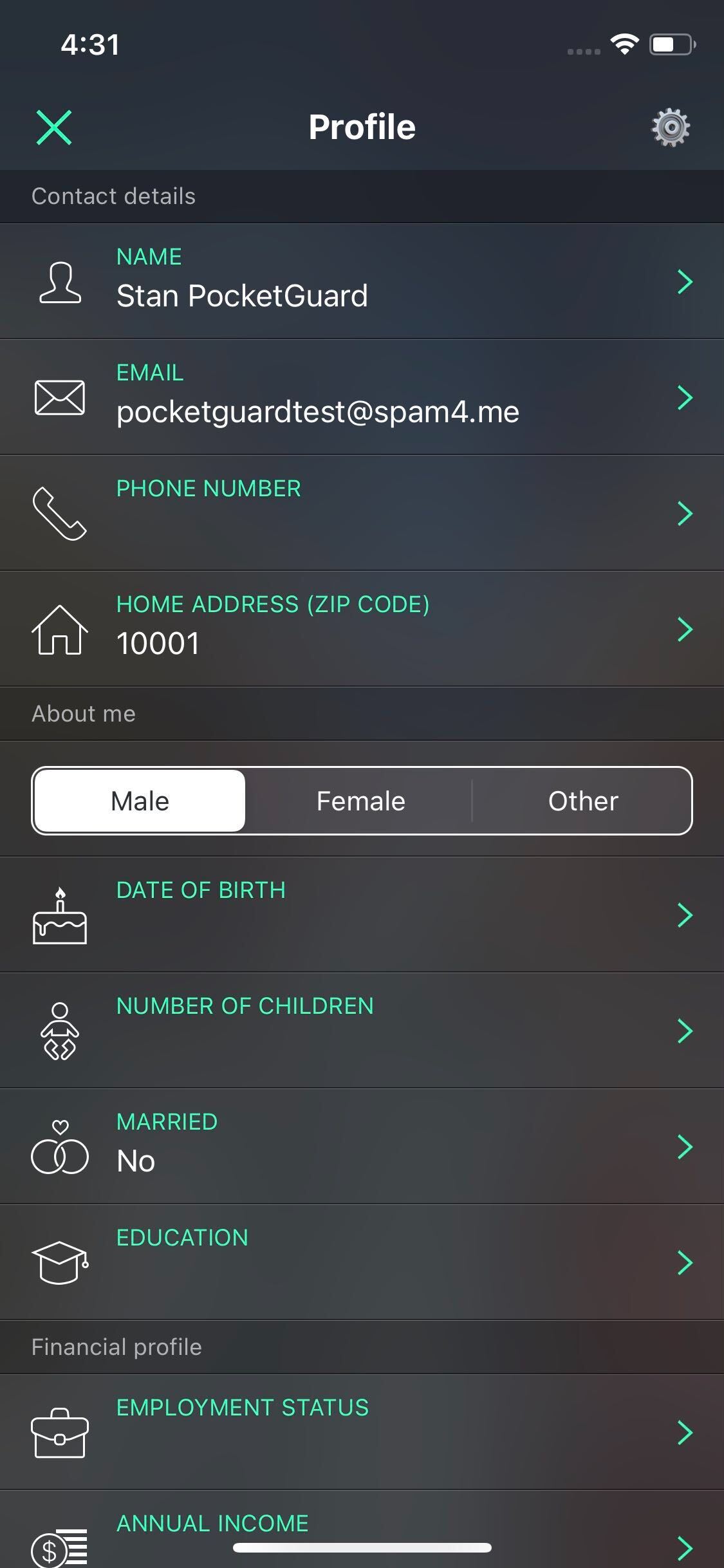 You can also fill in or change the name, phone number, zip code, “About me,” and “Financial profile” sections.