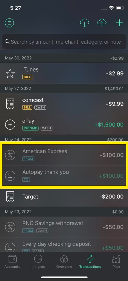 - Both transactions must be categorized as “Credit Card Payment”, or “Savings”, or “Transfer”;