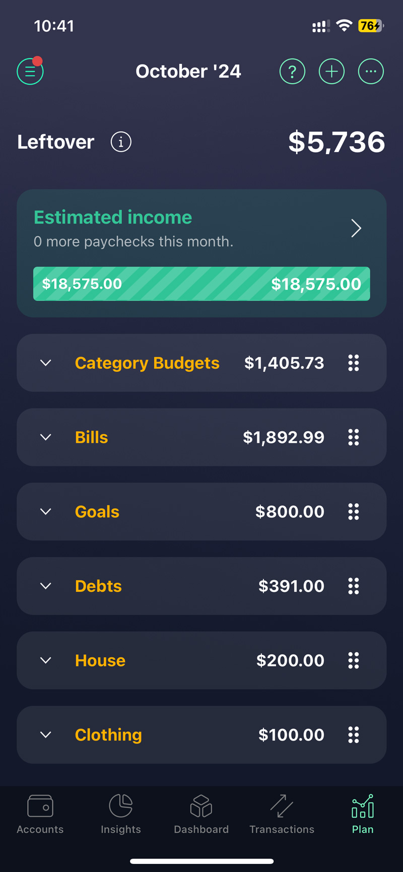 Leftover shows how much money you can save or spend on everything else after setting aside enough to cover your Bills, Budgets, Goals, and Debts.